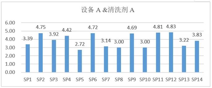 由以上實驗結(jié)果條形圖可以直觀地看出,18塊板子在設(shè)備A、B、C、D中被清洗的結(jié)果完全不同。設(shè)備A工作后達到的最大潔凈度是4,設(shè)備B中所有板子普遍穩(wěn)定在4-5之間,設(shè)備C中有最多達到水平為5的板子,設(shè)備D中結(jié)果起伏最大。由此判斷,當使用相同堿性清洗劑時,同一款污染物在四種不同的設(shè)備中呈現(xiàn)不同的清洗效果。